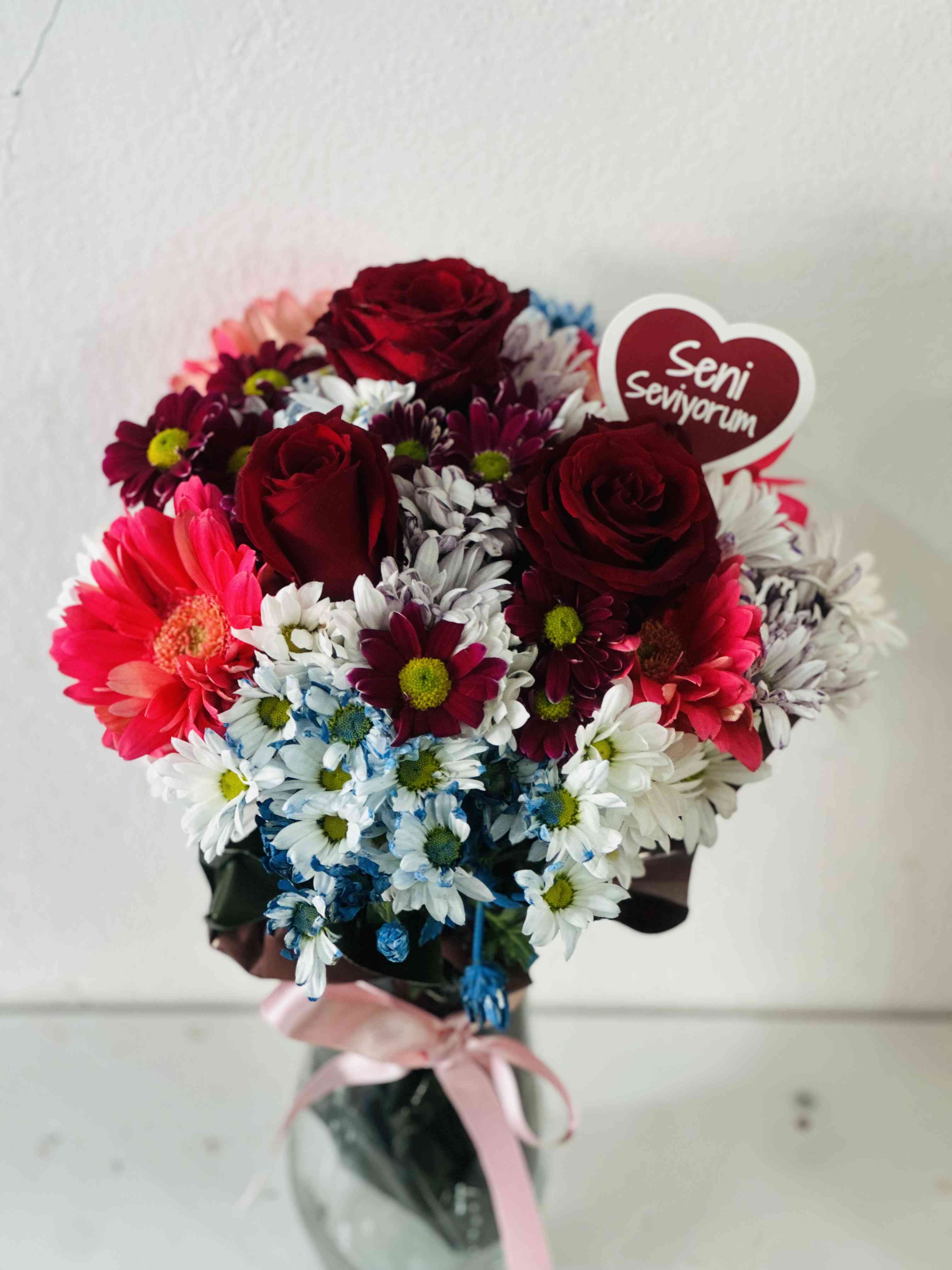Nizip Çiçekçi Cam Vazoda Karışık Gül ve Mevsim Çiçekleri Aranjmanı