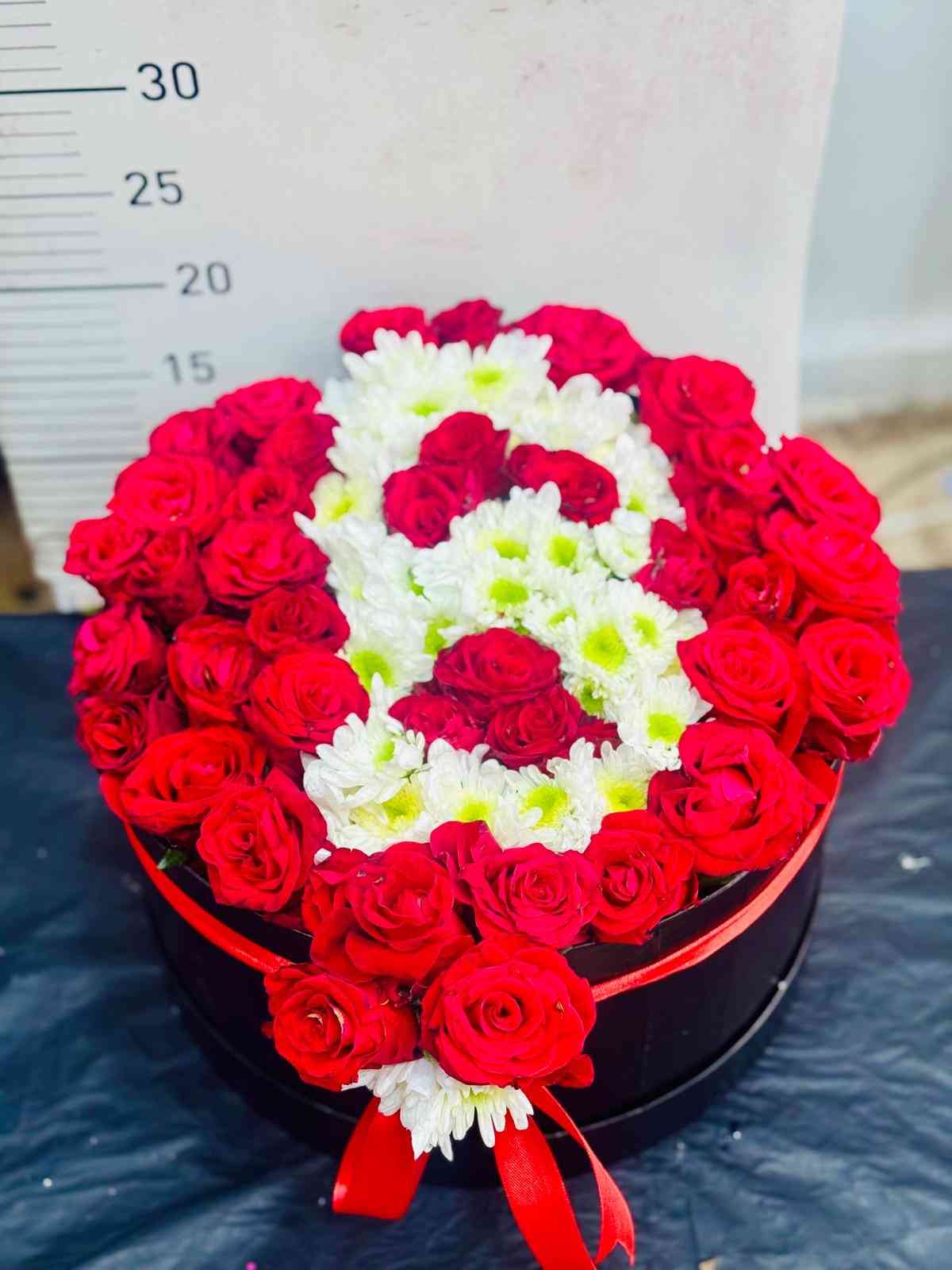 Kutuda kırmızı güller ve papatyalar.